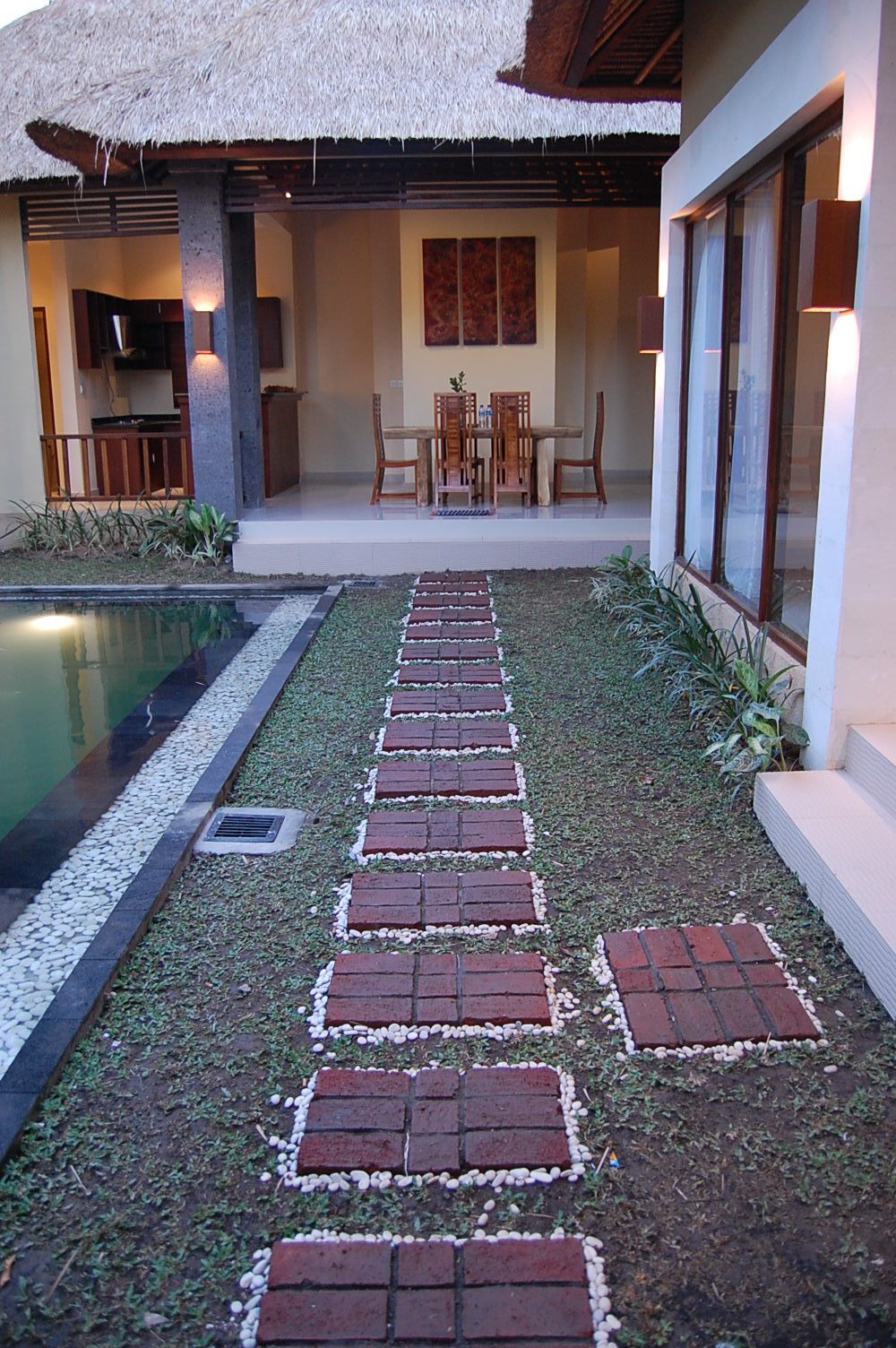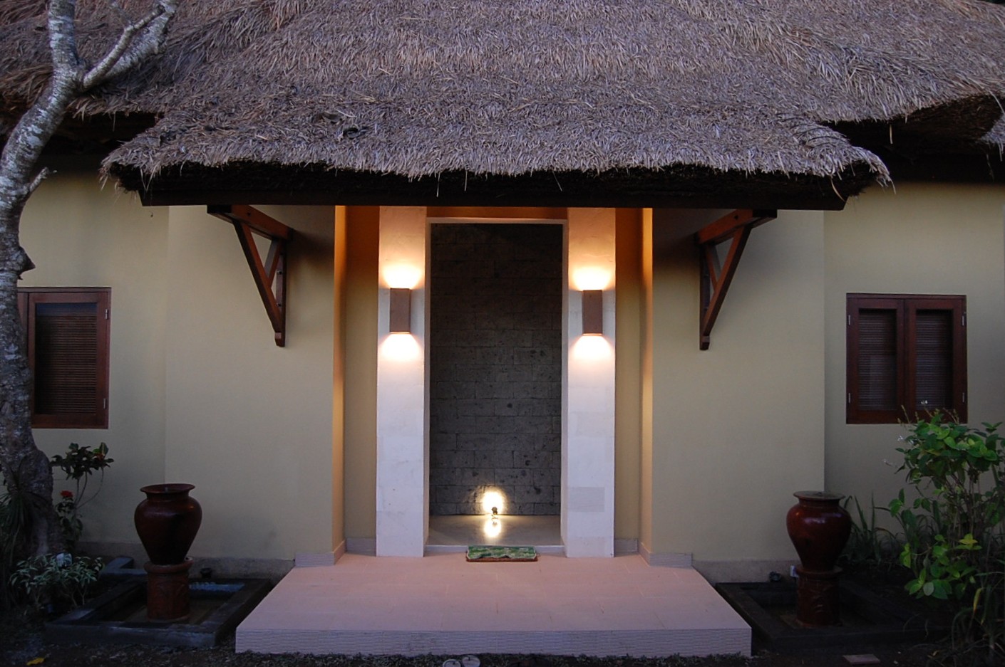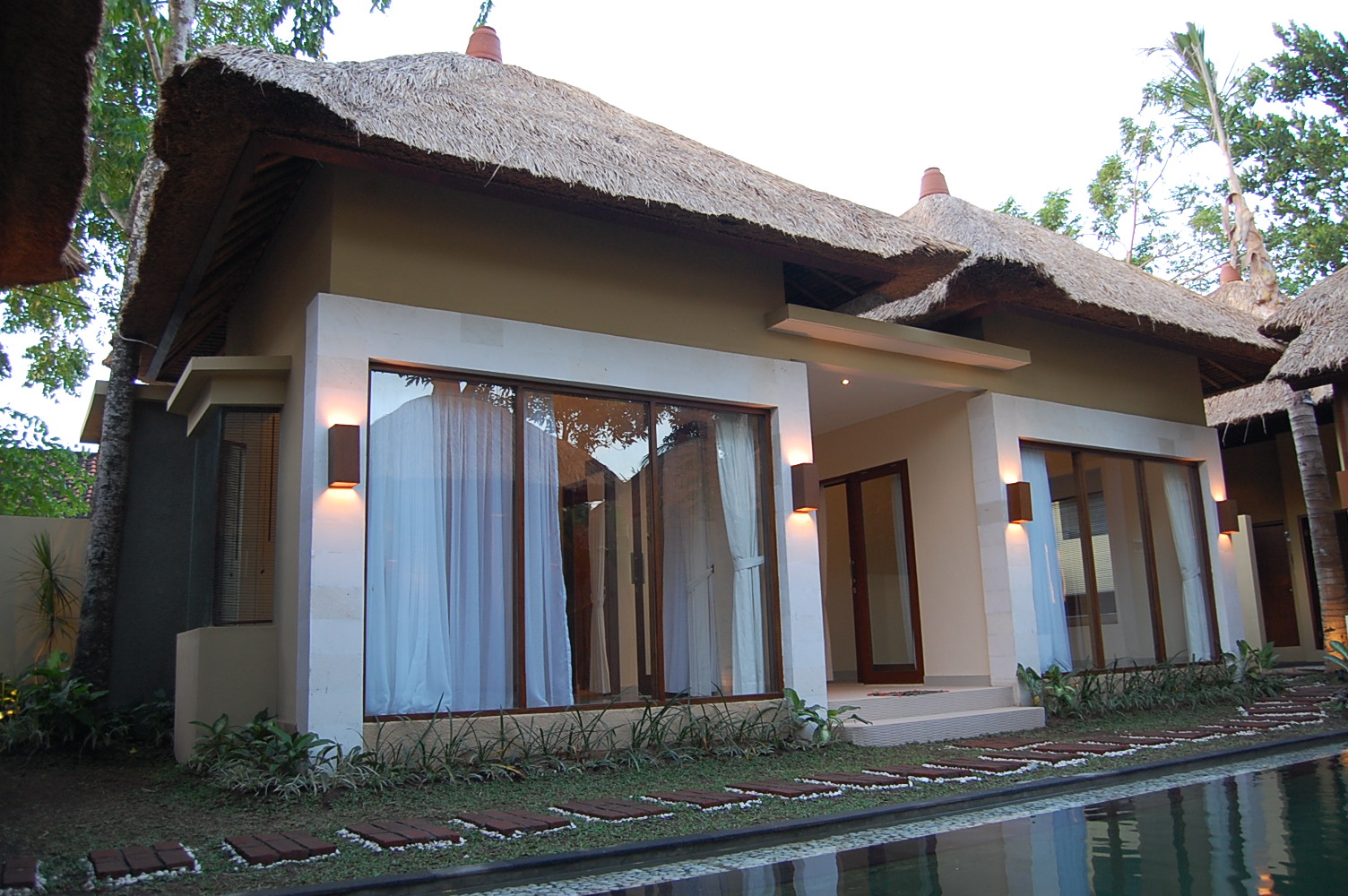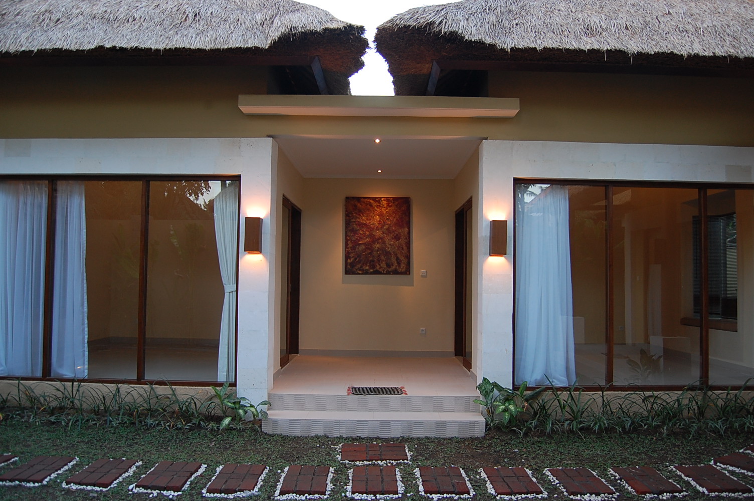 Kami melaksanakan konstruksi unit villa dengan gaya Tradisional Tropis Bali. Fokus utama proyek ini adalah eksekusi detail arsitektur lokal, khususnya pemasangan atap jerami/alang-alang yang menjadi ciri khas dan membutuhkan keahlian khusus. Proyek ini menampilkan kombinasi harmonis antara dinding berwarna earth tone dengan frame jendela dan pintu kayu gelap yang dominan. Kualitas finishing eksterior ditekankan untuk menciptakan suasana resort yang intim dan nyaman, dilengkapi dengan jalur setapak dan pencahayaan aksen yang terintegrasi di samping kolam.